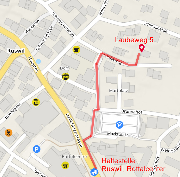 Zu Fuss ist der Raum in rund 5 Minuten von der Bushaltestelle zu erreichen, siehe Karte oben.